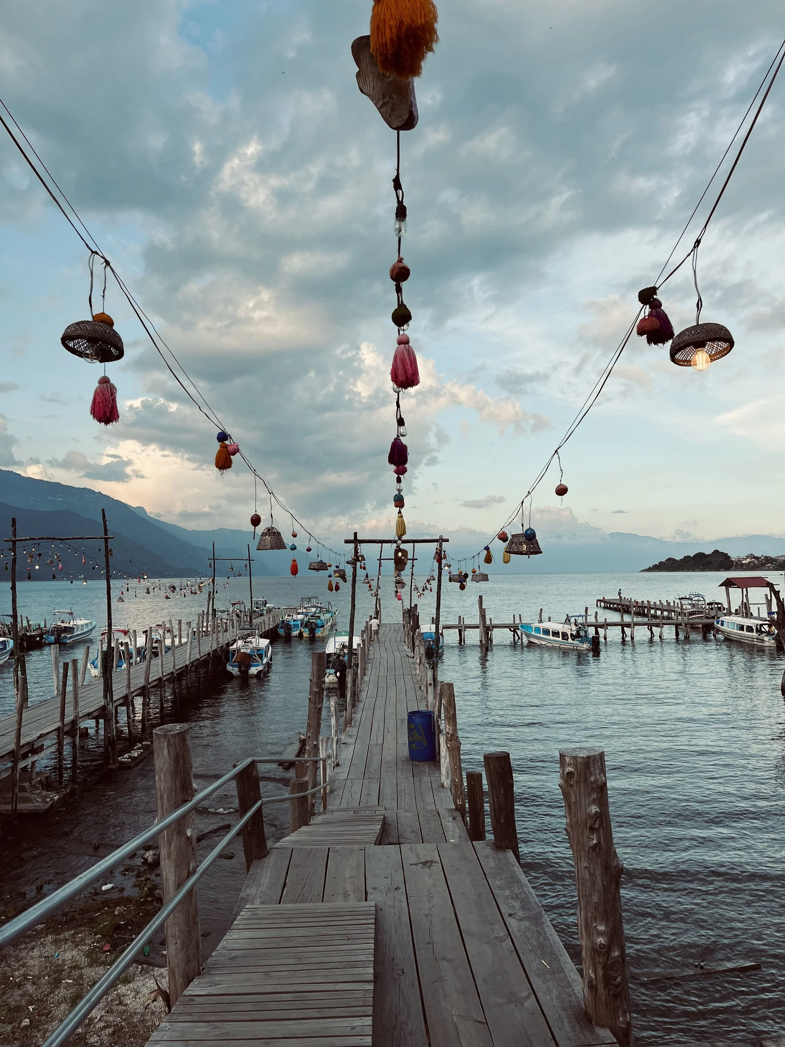 The vibe and atmosphere here are incredible! With the boat taxis, you can visit all the spots around the lake, which is so much fun. In the main town, Panajachel, there's a huge market with beautiful fabrics, materials, and clothes. Each little town has its own charm and character. We stayed in Santa Cruz la Laguna, a quieter place with a lovely small hotel by the water—it was a joy to be there. San Juan La Laguna is definitely worth a visit, with its beautifully decorated streets and cozy bars and restaurants.